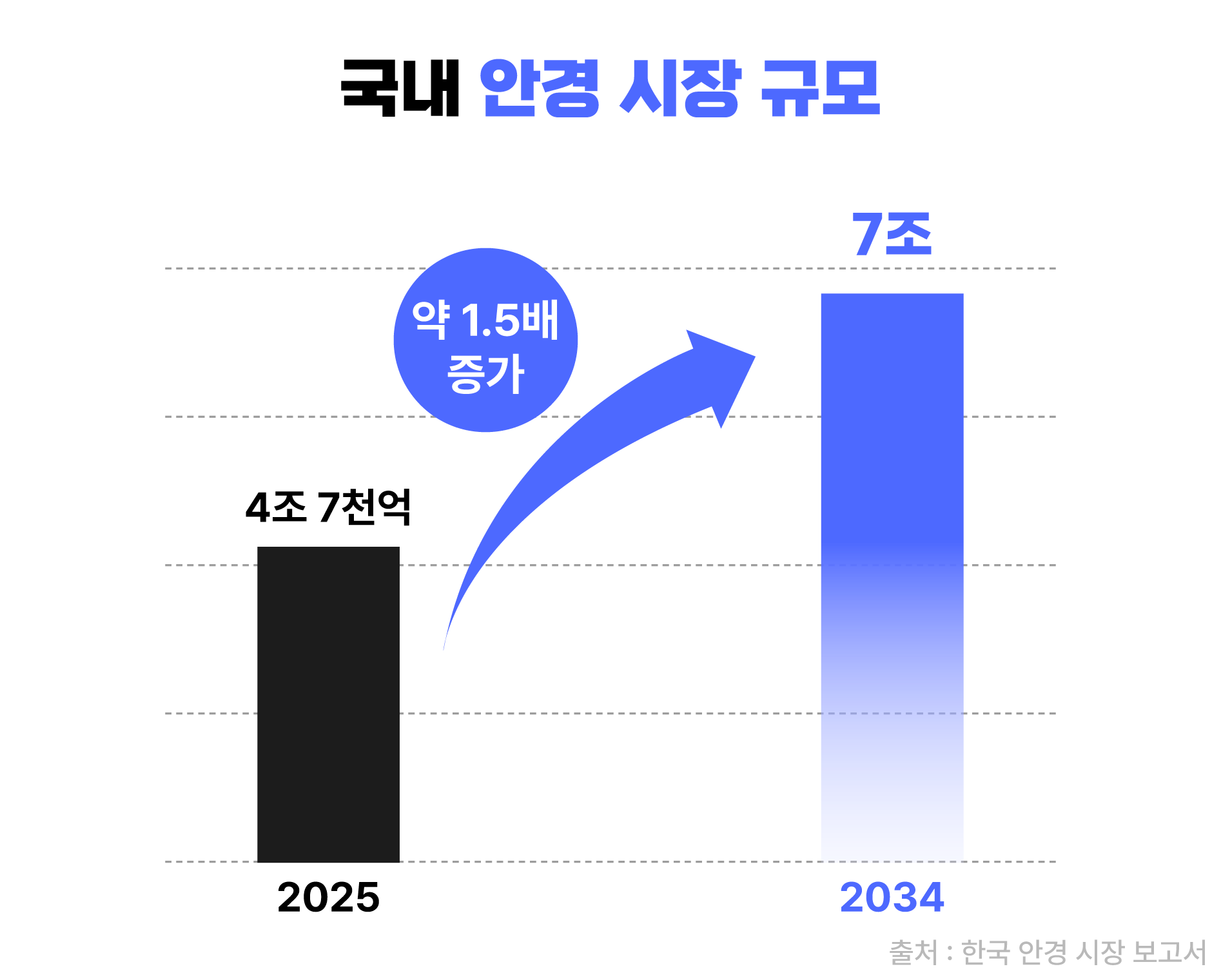 이 변화는 시장 규모에서도 확인할 수 있는데요. 한국 안경 시장 보고서에 따르면 국내 안경 시장 규모는 2025년 기준 약 4조 7천억 원에 달하며, 이후에도 연평균 4.91%씩 성장해 2034년에는 약 7조 원 규모까지 확대될 것으로 전망되고 있어요.