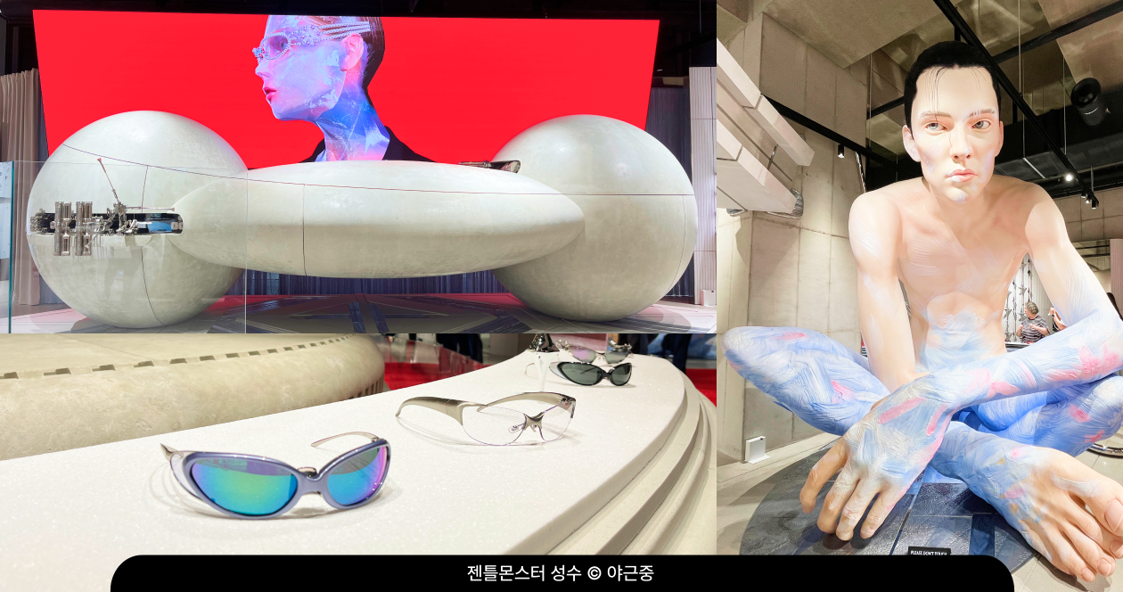 이런 연출에는 분명한 의도가 담겨 있어요. 젠틀몬스터는 제품을 전면에 내세우기 보다 브랜드의 세계관에 먼저 들어오게 만드는 전략을 택한 거예요. 공간을 가득 채운 조형물들은 젠틀몬스터가 추구하는 실험적 태도를 말없이 전달하고, 방문객은 별다른 설명 없이도 브랜드의 감도와 세계관을 자연스럽게 인식하게 되죠.