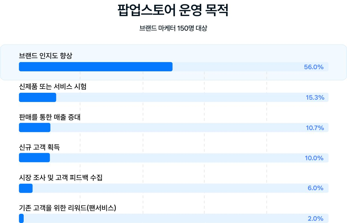 뿐만 아니라, 스위트스팟이 진행한 브랜드 마케터 150명을 대상으로 한 설문조사에서도 응답자 50% 이상이 팝업스토어를 오픈하는 주요 목적으로 브랜드 인지도 향상을 꼽았는데요. 즉, 브랜드가 팝업스토어를 통해 기대하는 효과가 소비자 조사 결과를 통해 실제로 충족되고 있다는 것이 확인된 셈이죠.