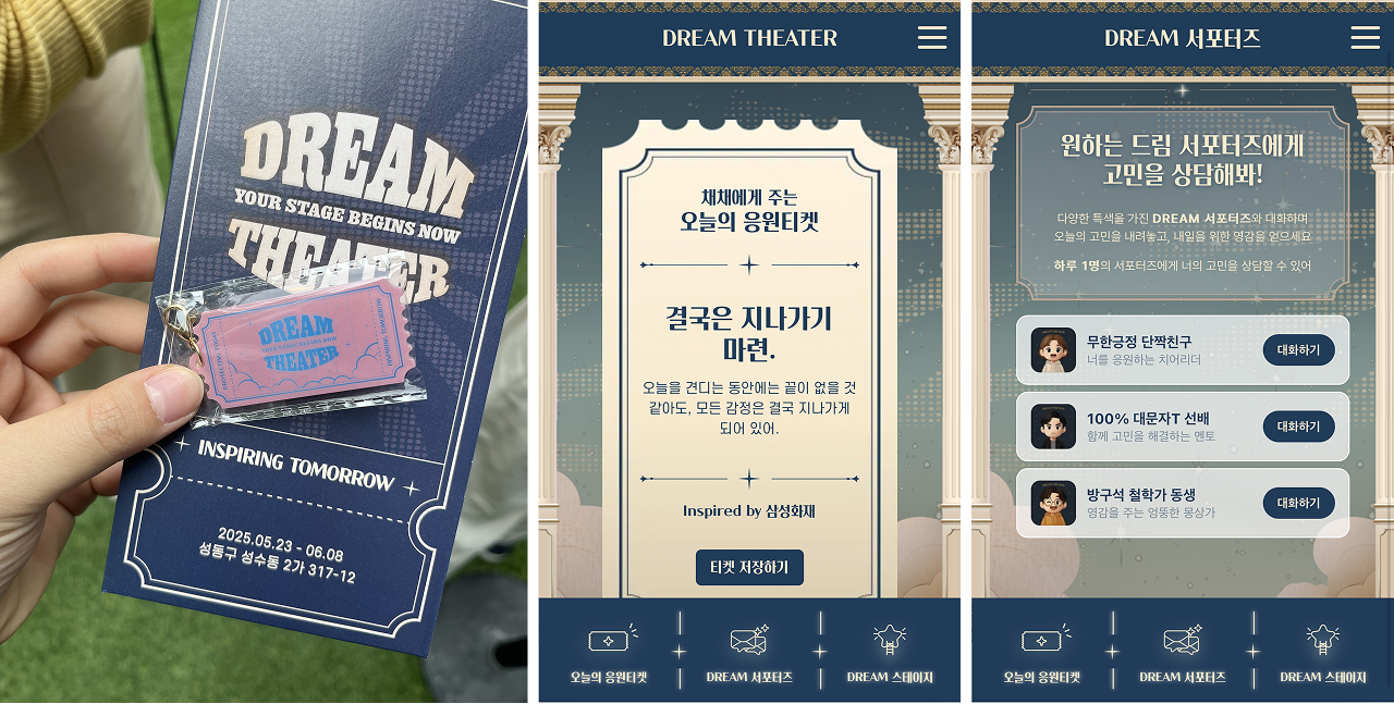 키링을 핸드폰에 인식하면 삼성화재가 매일 제공하는 ‘오늘의 응원 티켓'을 확인할 수 있고 AI 드림 서포터즈와 1:1로 고민 상담을 나눌 수 있는 기능도 포함되어 있어요. 저도 실제로 이 키링을 테이블에 두고, 고민이 생기거나 잠깐 쉬고 싶을 때 한 번씩 태깅해보게 되더라고요.