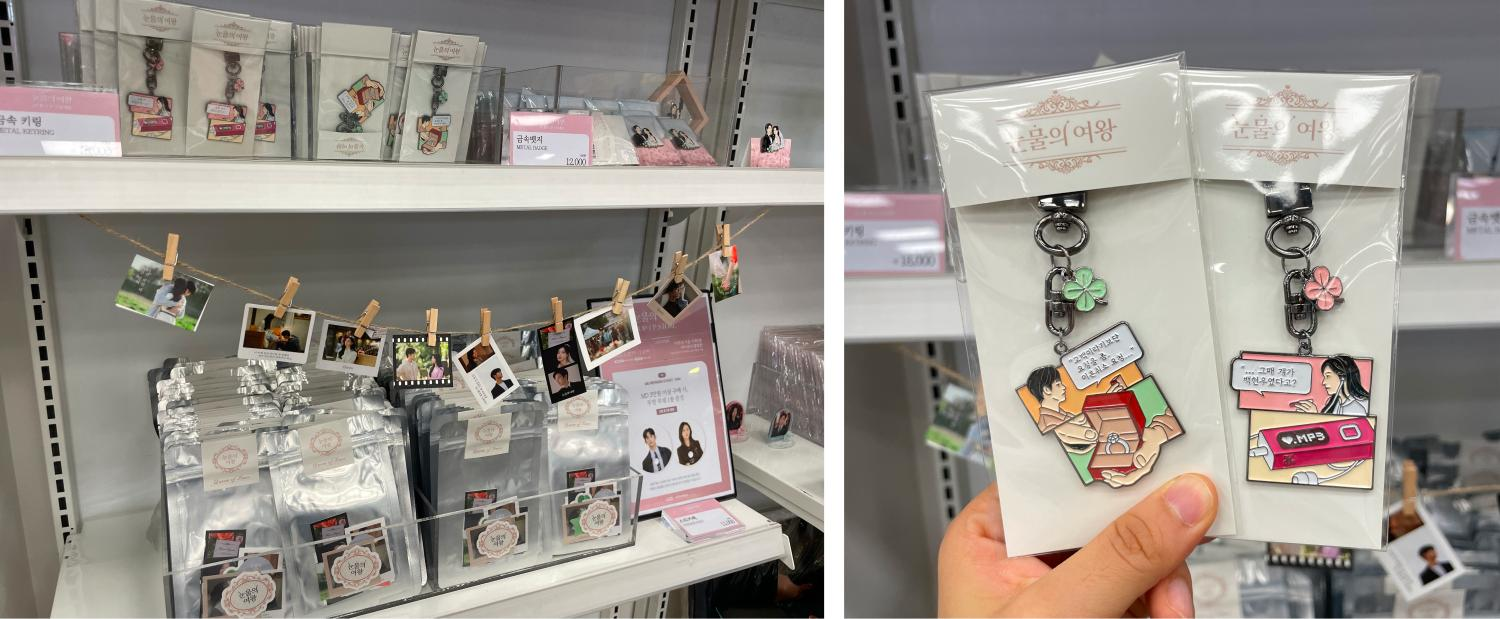 눈물의 여왕 팝업스토어에선 드라마의 추억을 되새길 수 있는 다양한 굿즈를 만나볼 수 있었습니다. 드라마 전개에 중요한 역할을 했던 네잎클로버를 미니 인형 키링으로 제작하거나 드라마 스틸 컷을 담은 미니 포토북, 스티커 팩 등의 제품들이 팝업스토어 곳곳을 풍성하게 채웠어요.
