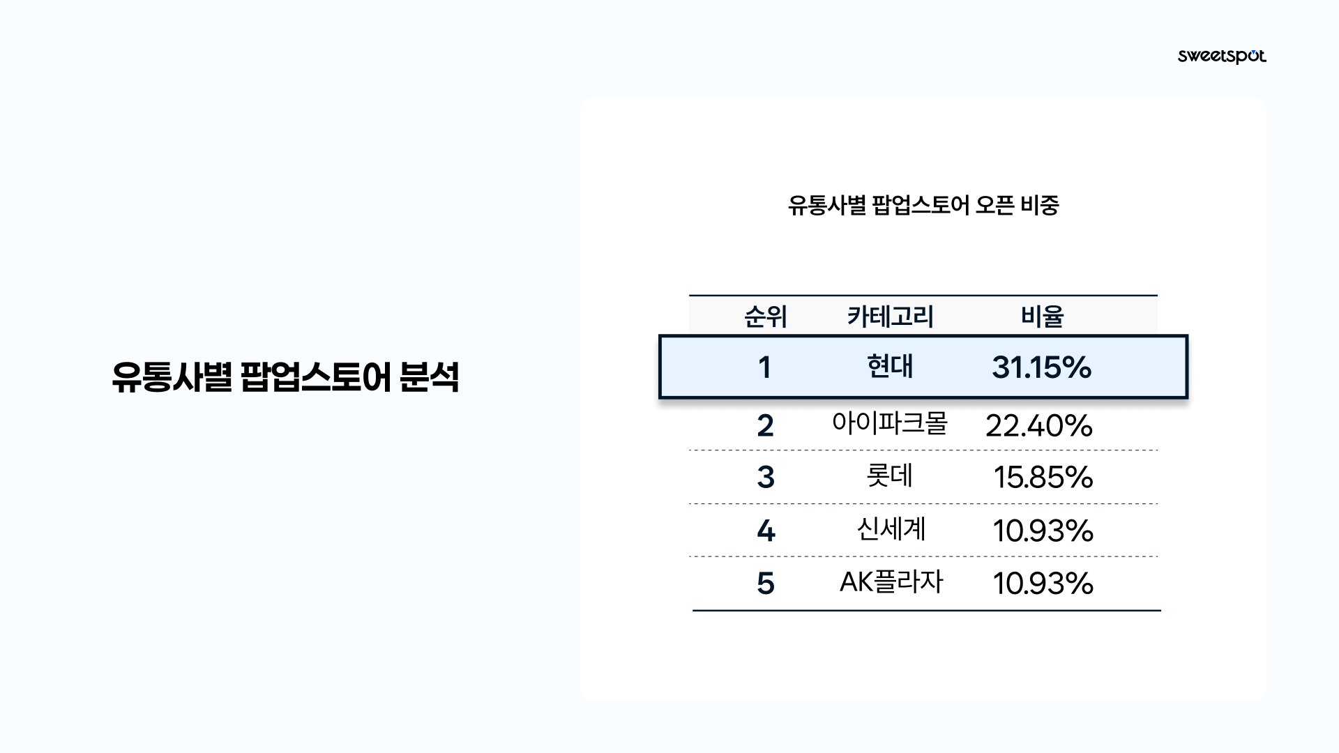 유통사별 점유율을 살펴보면 현대가 31.15%로 압도적인 1위를 기록했습니다. 특히 ‘더현대 서울’은 현대 내부 팝업의 약 68%를 소화하며 명실상부한 팝업의 메카임을 다시 한번 입증했어요. 그 뒤를 이어 ‘도파민 스테이션’이라는 강력한 테마 공간을 앞세운 아이파크몰(22.40%)과, 팬덤 중심의 IP·애니메이션 성지로 입지를 굳힌 AK플라자 홍대점이 시장을 나누어 가졌습니다.