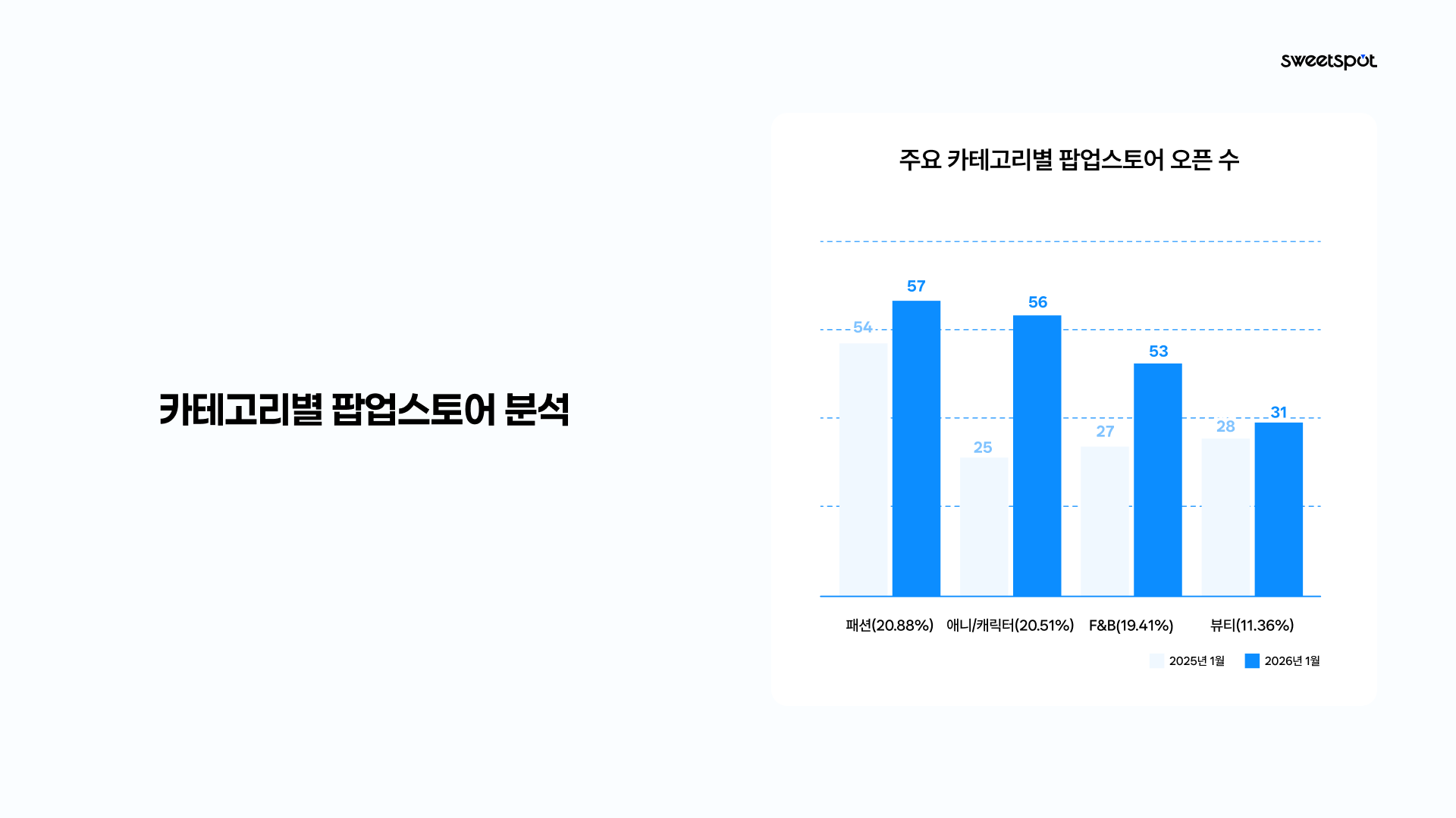 F&B 분야 역시 소금빵, 두쫀쿠 등 디저트 열풍이 식지 않으면서 오픈 수가 전년 대비 2배 가까이 성장했습니다. 전체적으로 보면 패션이 시장의 중심을 잡고 있는 가운데, 캐릭터와 F&B가 강력한 성장 동력을 보태며 1월 팝업스토어 시장의 파이를 키운 셈이에요. 한편 뷰티 카테고리는 작년과 비슷한 수준을 유지하며 안정적인 수요를 증명해냈습니다.