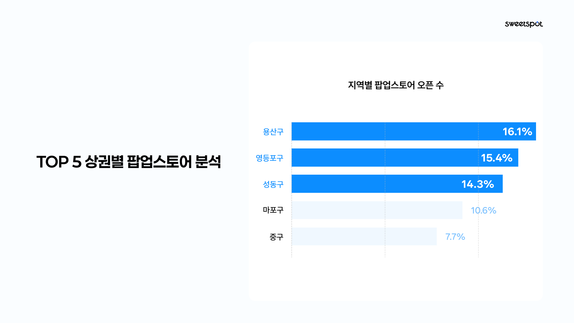 특히 주목할 점은 용산이 영등포를 제치고 1위에 올랐다는 거예요. 작년 1월에는 영등포구가 41개의 팝업스토어(비중 17%)를 유치하며 압도적 1위를 기록했고 그 뒤를 성동구와 강남구가 뒤따르는 양상이었는데요. 올해는 작년 영등포구의 기록을 넘어서는 총 44개의 팝업스토어가 용산구에서 집중적으로 열리며 상권 순위의 최상단을 갈아치웠어요.