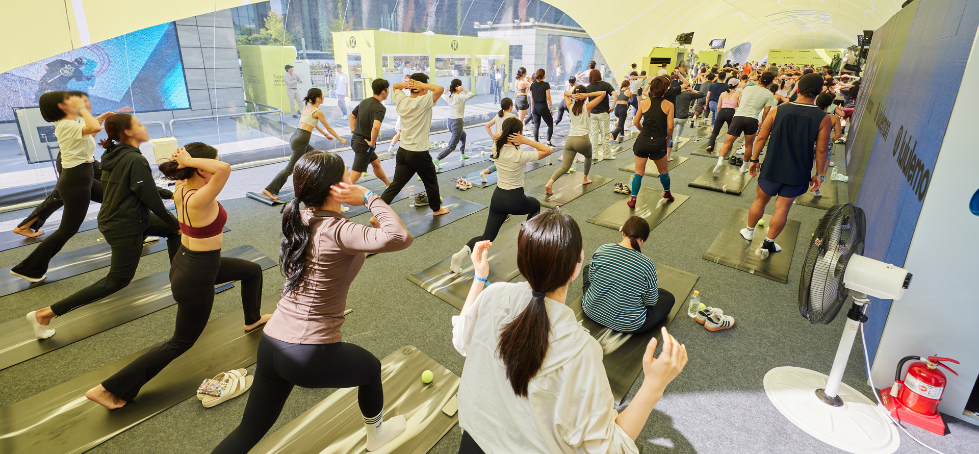 100여 명이 넘는 룰루레몬 커뮤니티 구성원들이 한데 모여 함께 액티비티를 즐길 수 있는 공간으로 재탄생했습니다.