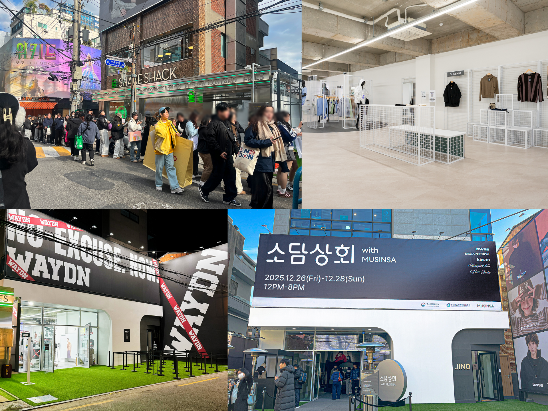 무신사 팝업스토어: 무신사는 입점 브랜드들의 통합 팝업을 위해 스테이지 엑스 성수 52의 넓은 평수와 층별 분리 구조를 적극 활용했습니다. 1층과 2층을 의류 전시 공간으로 활용해 브랜드별 독립성을 확보하면서도, 내부 계단을 통해 고객들이 자연스럽게 전체 라인업을 둘러보게 설계했어요. 외부 옥외광고판에는 대형 홍보 포스터를 걸어 시선을 사로잡았고, 야외 마당에는 붕어빵 존과 럭키드로우 같은 체험 거리를 배치해 단순한 쇼핑을 넘어 하나의 '놀이 문화'로 공간을 풀어냈습니다.